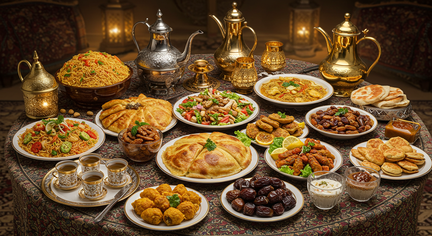 • الوصف: أطباق سعودية تقليدية (مندي، كبسة، هريس)، مقبلات ساخنة وباردة، تمر وقهوة.